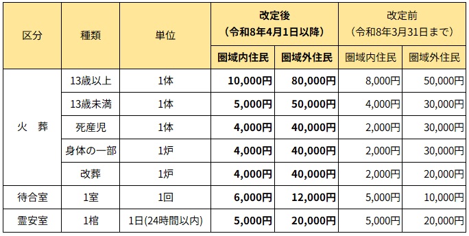 そこで様々な協議を重ねた結果,霞ヶ浦聖苑の火葬場使用料を令和8年4月1日から,下記の表のとおり改訂いたします。なお,霊安室使用料については変わりありません。